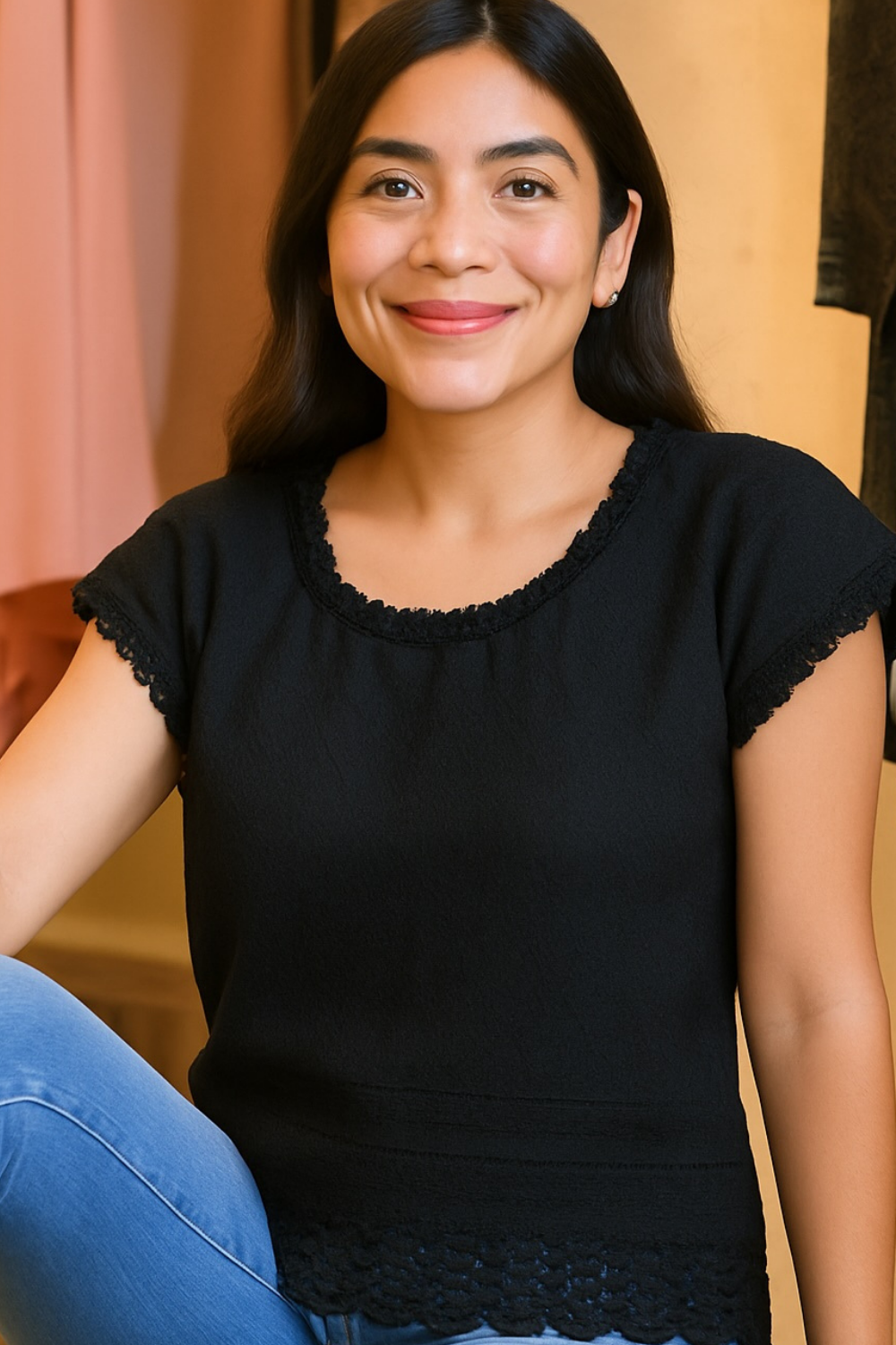 Esta blusa está tejida en telar de pedal por artesanos de Oaxaca. Su caída ligera y fresca la hace perfecta para el día a día, mientras que los detalles de encaje en el cuello, las mangas y la bastilla le dan un toque delicado y femenino.