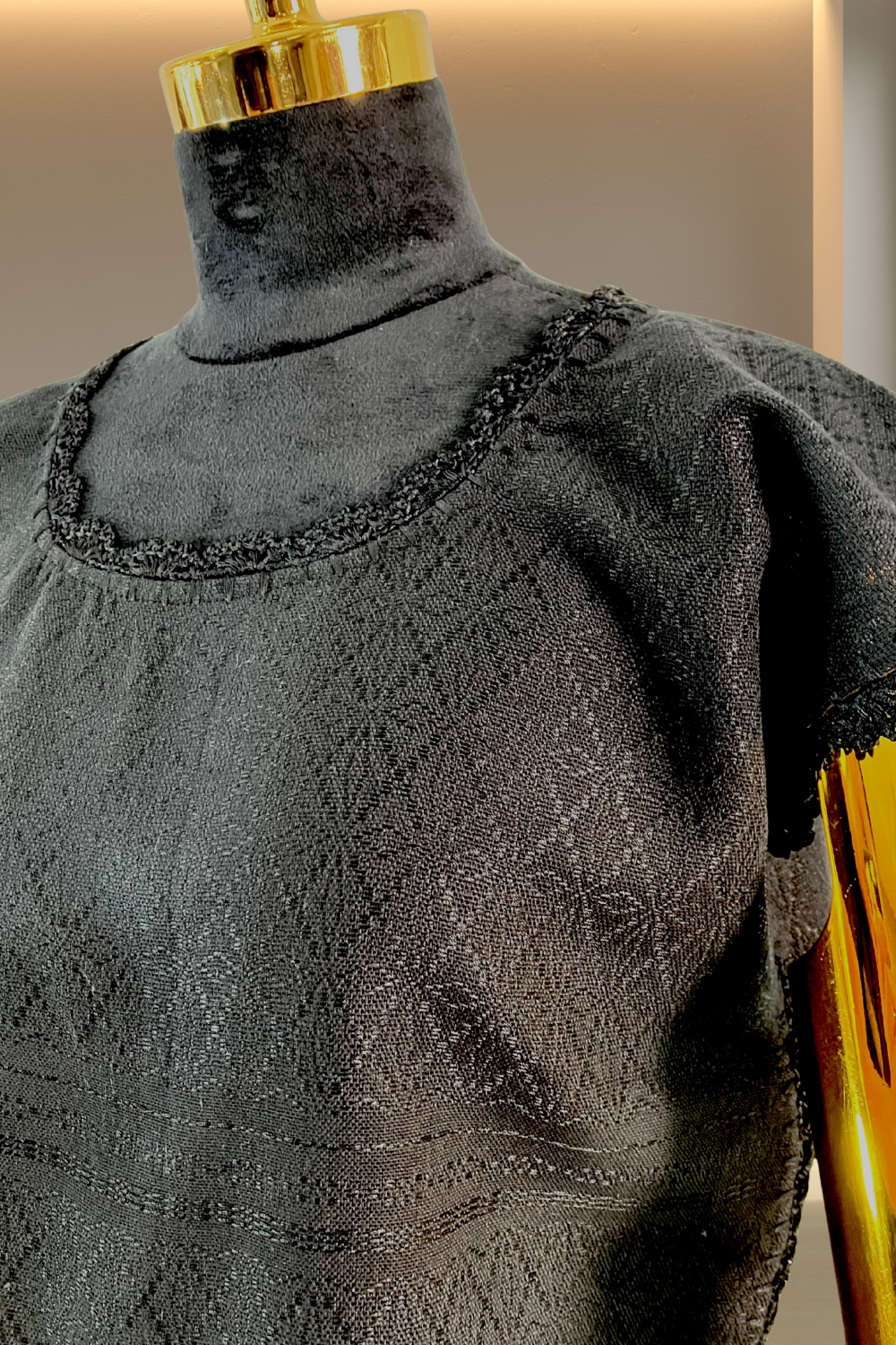 Cada pieza nace de un proceso lento: primero se teje la tela en telar de pedal y después se aplica el encaje de manera cuidadosa, respetando las técnicas tradicionales de la región. El resultado es una blusa cómoda, elegante y con historia, ideal para quienes buscan vestir algo especial y auténtico.