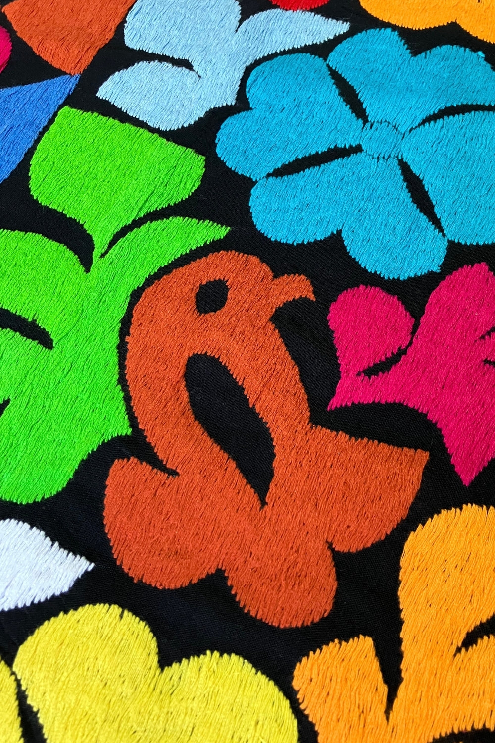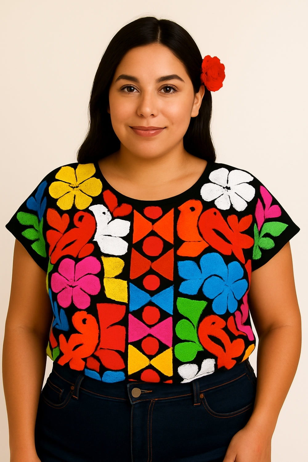 Estas blusas son verdaderas joyas textiles, bordadas completamente a mano por artesanas de Jalapa de Díaz, en la región mazateca de Oaxaca. Cada diseño refleja la herencia cultural de su comunidad, plasmando flores, aves y formas tradicionales con una explosión de color y detalle.