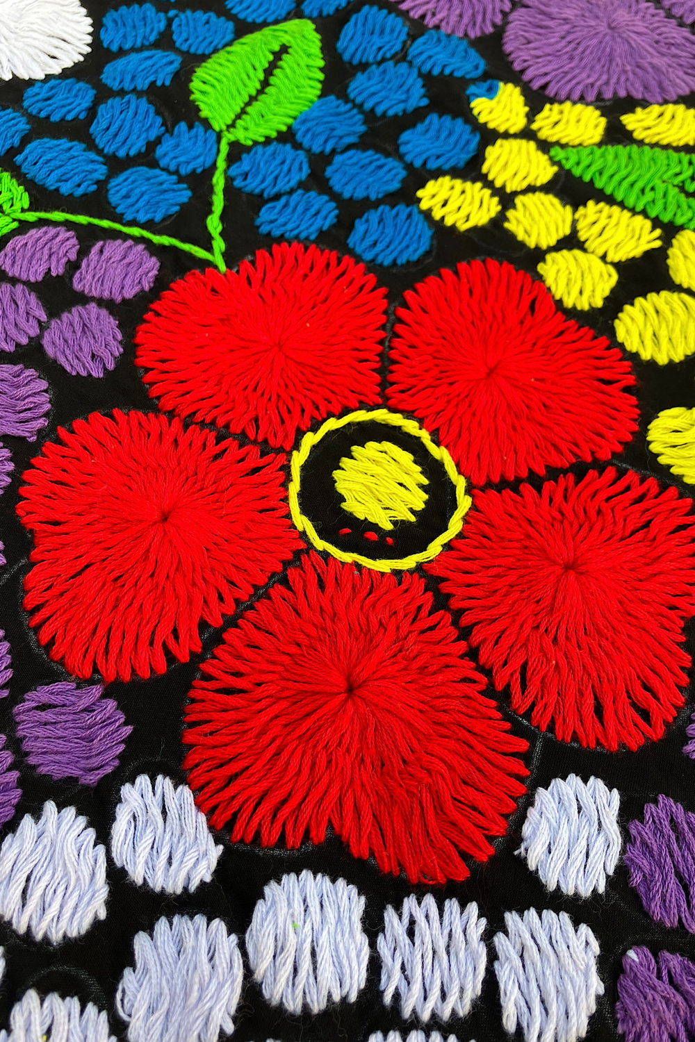 Estas blusas son verdaderas joyas textiles, bordadas completamente a mano por artesanas de Jalapa de Díaz, en la región mazateca de Oaxaca. Cada diseño refleja la herencia cultural de su comunidad, plasmando flores, aves y formas tradicionales con una explosión de color y detalle.