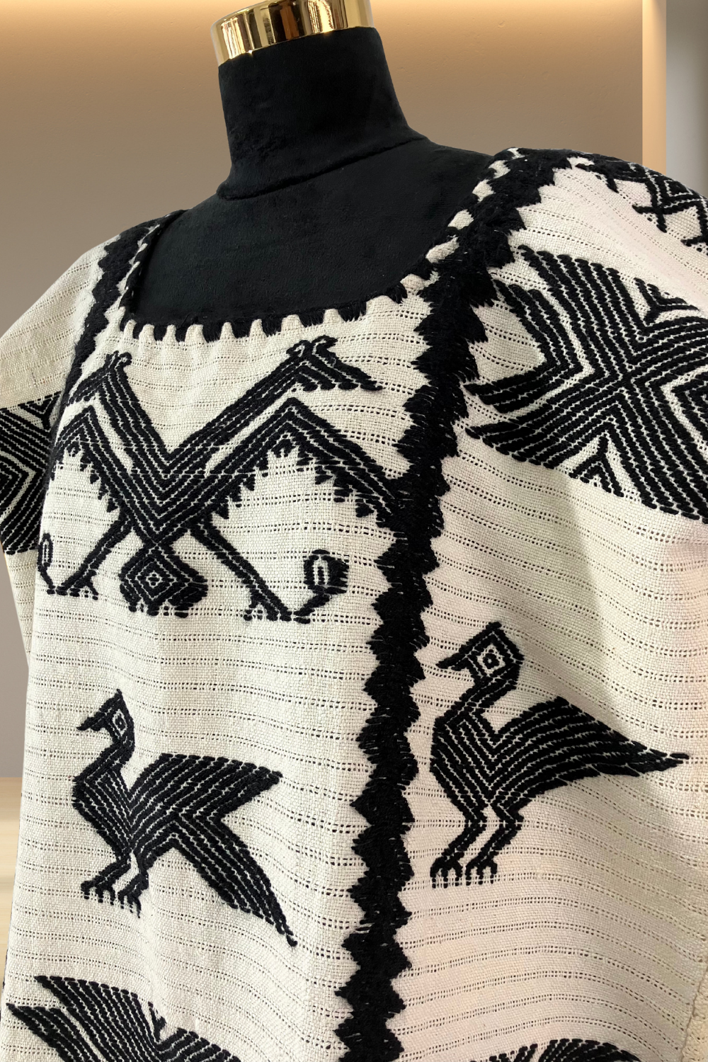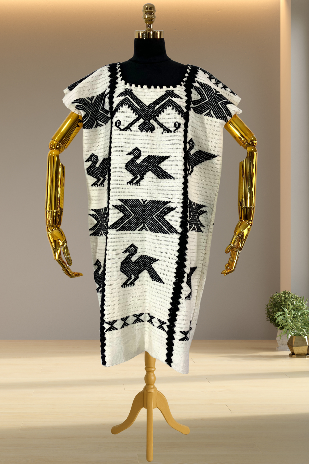 Este vestido está confeccionado en manta suave y fresca, realzado con delicado tejido fino hecho a mano en San Juan del Río, Oaxaca. Cada puntada refleja el talento y paciencia de las artesanas que mantienen viva una técnica ancestral.